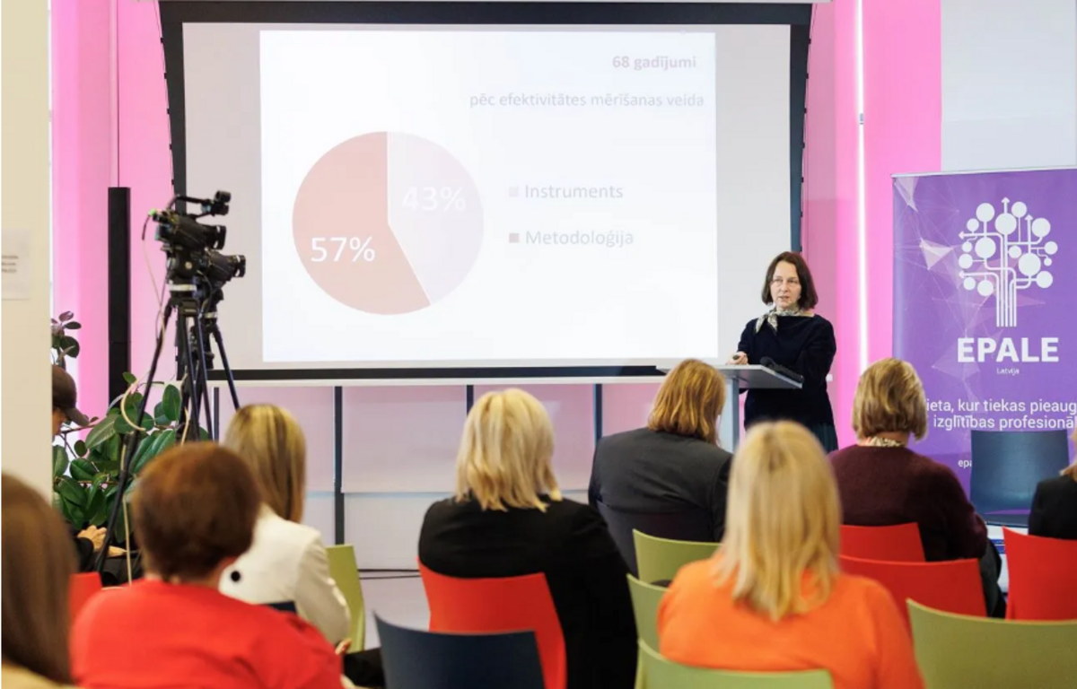 In the first part of the conference, Dr paed. Gunta Siliņa-Jasjukeviča, Associate Professor at the University of Latvia and Lead Researcher of the State Research Programme (SRP) “Education” project “Elaboration of evidence-based solutions for effective professional competence development of adults and assessment of the transfer of its results into practice in Latvia” (project No. VPP-IZM-Izglītība-2023/4-0001), delivered a presentation entitled “Adult Professional Development in Latvia — Insights from the State Research Programme ‘Education’ Project Results”.